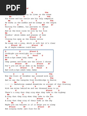 Learn Pop score for Piano Vocal Guitar by James Taylor in minutes. R Bm ock-a-bye sw G eet baby Ja D mes D Bm eep greens and bl G ues are the co D lors I choose Wont you E7sus let me go down in my d Asus reams And r G ock-a-by A7sus sweet. INTRO G GF Em A7sus4 A7 VERSE D A G Fm There is a young cowboy he lives on the range Bm G D Fm His horse and his cattle are his only companion Bm G D Fm He works in.